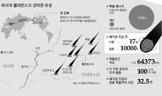 우주공간을 떠돌던 소행성 유성 등 지구 밖 물체들이 대기로 진입하면 대부분 마찰열에 의해 다 타버리는데 남은 조각들이 지구에 떨어지는 것을 운석이라고 한다. 조사결과 러시아에 떨어진 운석의 원래 규모는 지름 약 16.8m, 무게는 약 만 톤인 것으로 확인됐다. 이 운석이 대기권을 통과하며 마찰로 파괴돼 수십 개 이상 돌덩이로 조각나 지상에 떨어진 것. 현재까지 알려진 가장 강력한 지구 충돌 운석은 1908년 시베리아 퉁구스카 지역에 떨어 진 지름 40m 가량의 운석이다. 당시 이 운석은 반경 26Km 산림을 태웠지만 인명피해는 없었다. 하지만 이번엔 운석이 더 작은데도 피해가 더 컸다. 눈에 보이지 않는 충격파가 도시를 덮쳤기 때문이다.