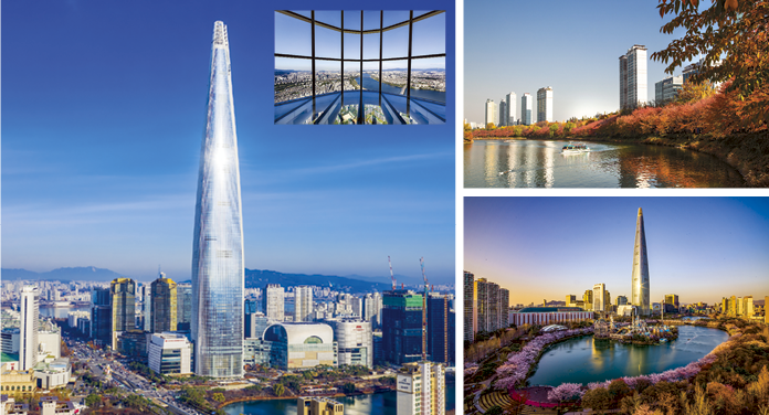 타워 아래 석촌호수는 봄엔 1000여 그루의 왕벚나무가 만개하여 벚꽃 터널이 만들어지는 장관이 펼쳐지고, 가을엔 울긋불긋한 단풍으로 사계절 내내 인기이다.
