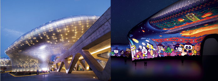 동대문디자인플라자(DDP)는 연간 1천만 명 이상이 방문하는 서울의 대표적인 복합문화공간이자 디자인 랜드마크다. 개관 직후 뉴욕타임스 선정 ‘꼭 가봐야 할 세계 명소’로 꼽혔으며, 다양한 전시와 문화 행사가 연중 이어진다. 유명 건축가 자하 하디드(Zaha Hadid)가 설계한 DDP는 세계 최대 규모의 3차원 비정형 건축물로, 곡선과 곡면을 활용한 미래적인 외관이 특징이다. 건축물 자체가 하나의 작품으로 평가받으며, 밤에는 미디어 파사드가 더해져 서울의 상징적인 야경을 완성한다.