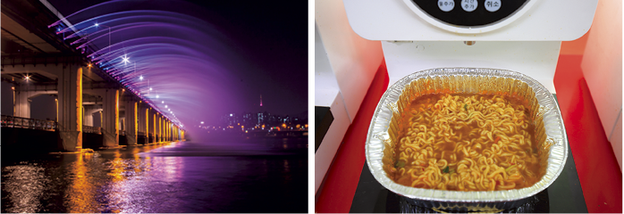 반포한강공원의 상징인 달빛무지개분수. 2008년 세계에서 가장 긴 교량 분수로 기네스에 등재되며 세계적인 명성을 얻었다.(좌)