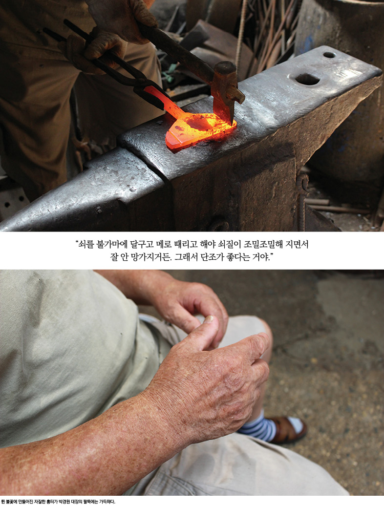 “요즘에 누가 직접 메질(망치질)해서 연장을 만들겠어. 다들 프레스로 찍어 내고 딸딸이 햄머(전동 단조기)로 때려 만들고 말지. 그런데 그렇게 해서는 제대로 된 물건이 안 나와. 쇠를 불가마에 여러 차례 달구고 모루에 올려 때리고 해야 쇠질이 조밀조밀해 지면서 강도도 생기고 잘 안 망가지거든. 그래서 단조가 좋다는 거야.”