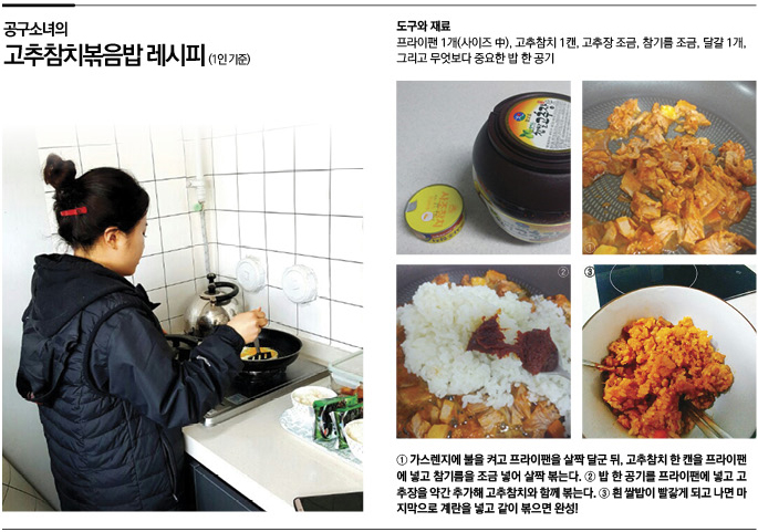 본점에서 일할 때는 가족들이 다 함께 있었기 때문에 내가 잠깐 집에 올라가 점심 식사를 만들어 와도 괜찮았다. 심지어 김밥, 잡채, 제육볶음 등 손이 많이 가는 요리도 만들 시간이 충분했다. 그런데 인화점 지점이 문을 열고 부모님과 떨어져서 우리 삼남매끼리만 장사를 하다 보니 요리를 할 시간도 충분치 않아 초기에는 배달 음식만 시켜먹었다. 그렇게 시켜먹는 것도 하루이틀이지 매일 그럴 수도 없는 노릇이다. 빠르고 간편하게 요리해서 먹을 수 있는 방법을 생각해 봤다. 그렇게 만들어진 나만의 공구상 레시피가 벌써 여럿! 그 가운데 제일로 간단하게 만들 수 있는 요리를 소개하려 한다. 바로바로 고추참치를 이용한 고추참치볶음밥이다. 너무나 간단해서 요리 좀 하시는 분들은 ‘애걔걔, 이게 요리야?’하실 수도 있다. 하지만 고추참치의 그 고소하면서도 매콤한 맛을 좋아하시는 분들이라면 생각보다 훨씬 더 만족하실 거라 생각한다.