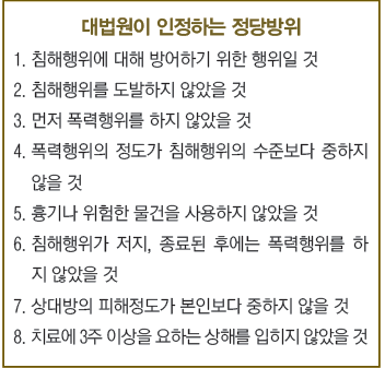 대법원은 이와 같은 기준을 모두 충족하는 경우에 정당방위로 판단하고, 요건 중 일부를 충족하지