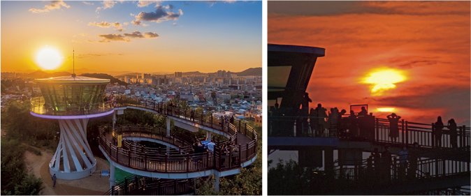 대구 남구 앞산해넘이전망대는 붉은 석양과 하나둘 켜지는 도시 불빛, 그리고 떠오르는 달까지 마치 파노라마와 같은 빛의 연속을 한눈에 즐길 수 있다.