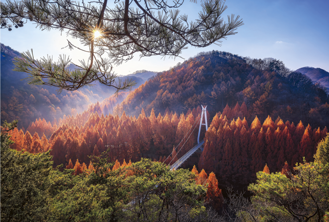 메타세쿼이아 숲길로 유명한 이곳은 가을이면 길고 곧게 뻗은 나무들이 붉게 물들어 장관을 이룬다. 하늘다람쥐와 이끼도롱뇽이 서식하는 생태 숲으로도 유명하며 이 아름다운 경관 덕분에 2018년 대통령의 휴가지로 선정된 바 있다. 입장료와 주차료가 무료로 개방되어 있어 시민 누구나 즐길 수 있고, 숙박 외 출렁다리, 스카이웨이, 전망대 등 다양한 체험 공간이 마련되어 있다.