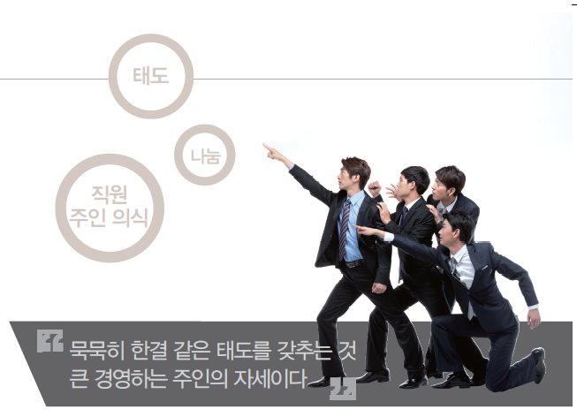 직원이 아무리 잘못했어도 고객 앞에서는 절대 꾸중하지 않고, 내가 하기 싫은 일은 직원도 하기 싫다는 걸 잘 알아 솔선수범하고, 칭찬을 할 일이 있으면 큰 목소리로 기쁘게 칭찬한다. 종업원이 낸 아이디어가 있다면 적극 받아들여 검토하고, 내가 자리를 비웠을 때 잘한 부분에 대한 평가를 더 높이 한다. 이것이 바로 직원의 주인의식을 높이는 방법이다.