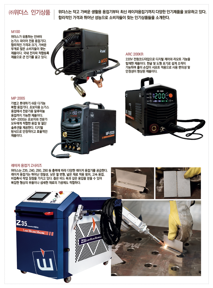 ㈜위더스는 2005년 설립된 용접 솔루션 및 제조, 유통기업이다. 인버터 용접기부터 플라즈마 절단기, 레이저, 각종 용접 소모품, 산업용 로봇, 협동 로봇 등 다양한 제품을 공급하고 있다. 위더스의 강점은 국내외 다양한 산업 현장과 고객 수요에 맞는 첨단 장비와 맞춤 서비스를 제공한다는 점이다. 특히 2017년 국내에는 생소했던 용접용 협동 로봇을 도입했고 2020년대 국내 시장 환경에 적합한 생활용 용접기를 기획 발굴해 큰 화제를 모았다. 우수한 제품을 발굴해 국내 시장에 유통하면서 고객 중심의 기술 서비스를 내세워 소비자의 신뢰를 쌓았다.