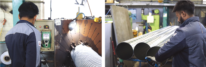 “제대로 만든 플렉시블 덕트는 건설 현장에서 바로 티가 납니다. 좋은 제품은 재료가 충실히 들어가야 하고 상황에 따라 보온 단열 효과 내습성과 방염성이 필요하죠. 가격과 겉모습만 보고 제품을 구매하고 사용해서는 안 됩니다. 플렉시블 덕트는 제작에 사용된 원단과 탄소체강선의 굵기, 강선 간격이 품질에 영향을 줍니다. 플렉시블 덕트 형태는 원단에 탄소체강선을 나선식으로 접착하여 만들죠. 탄소체강선에 원단을 둘렀다고 생각하시면 됩니다. 저가형의 경우 강선 간격을 넓게 늘린 형태죠. 그렇게 되면 강선을 적게 사용할 수 있지만 내구성이 떨어집니다.”