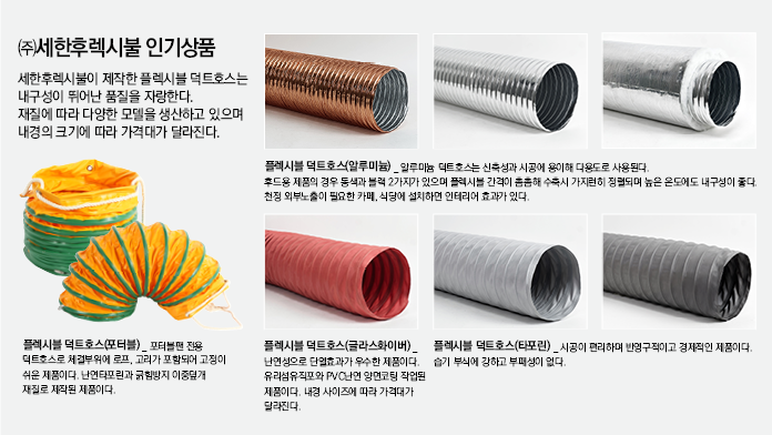 플렉시블(flexible)은 ‘유연한’이라는 뜻이다. 플렉시블 덕트는 고정된 단단한 덕트(duct, 배관)와 달리 유연하게 구부러질 수 있는 공기 배관을 말한다. 주로 알루미늄 호일, 폴리에스테르 필름, PVC, 또는 타포린 등의 재질로 만들어지며 내부에 나선형 와이어가 들어가 있어 쉽게 구부러지면서도 구조체 형태를 유지한다. 고품질의 플렉시블 덕트와 스파이럴 덕트, 오발 덕트 등 다양한 제품군을 생산하는 ㈜세한후렉시불을 알아보자.