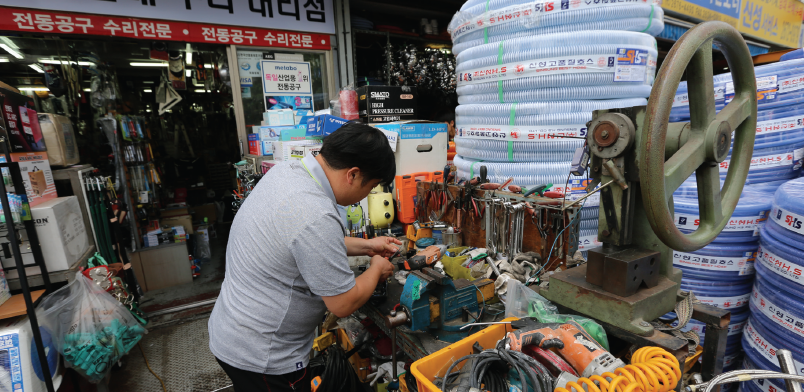 “외삼촌 밑에서 나와 도매업을 했어요. 그런데 도매업을 하다보니 점점 마진이 없어지더라고요. 왜 그런고 하니 큰 공구유통회사에서 지방 구석구석을 돌아다니기 시작한거죠. 지방 곳곳에도 도로가 많이 뚫리니까 중소 도매상의 영역인 지방 구석구석을 그렇게 확장 하더라고요. 그때 저는 느꼈죠. 빨리 손을 털고 변신을 해야겠구나. 그래서 8년 전에 발 빠르게 손 털고 소매 공구상으로 업종 전환했죠. 처음 시작할 때 너무 힘들었어요. 너무 적게 시작 했거든요. 소매도 안하고 도매하고 수리만 했는데 수리로 현금 조금 확보를 하고 신용을 쌓으려고 엄청나게 신경을 썼어요. 받을 돈은 못 받더라도 줄 돈은 꼭 줬죠. 그래야 물건을 싸게 건네어 주니까. 날짜 늦어지면 안됩니다. 내가 싸게 사야 물건을 싸게 공급할 수 있어요.”