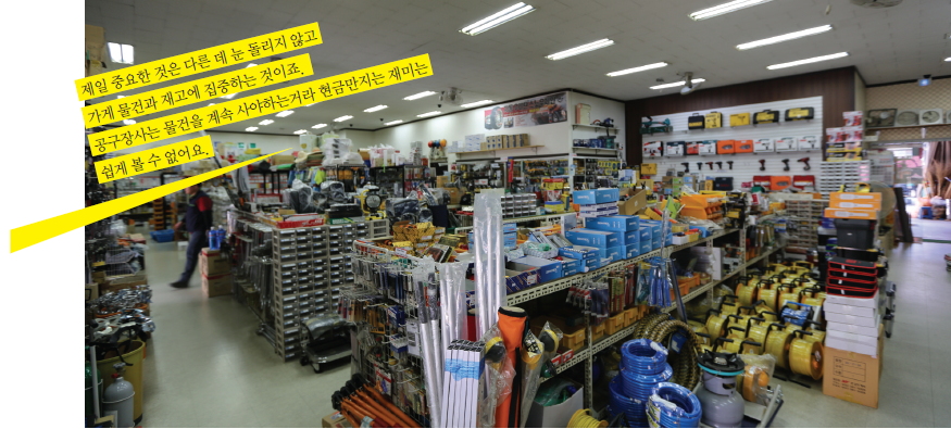 "초창기는 납품을 중심으로 했지요. 그러다가 납품만으로는 안되겠다 싶었습니다. 납품을 하면서 동시에 소매도 크게 하고 싶었어요. 미국의 홈디포처럼 큰 소매 공구상을 목표로 삼고,얻은 이익을 다시 끊임없이 재투자 하였습니다. 형제가 마음을 맞대어 역할분담을 하고 서로 이해를 하며 계속해서 가게의 물건을 늘려나갔지요. 여러 방법을 동원해 대출도 받고 또 저렴하게 땅도 빌릴 수 있었어요. 찾아보면 방법은 나옵니다. 제일 중요한 것은 다른 데 눈 돌리지 않고 가게 물건과 재고에 집중하는 것이죠. 공구장사는 물건을 계속 사야 하는거라 현금 만지는 재미는 쉽게 볼 수 없어요. 하지만 가게가 커지고 마음이 든든해지는 면은 있어요"