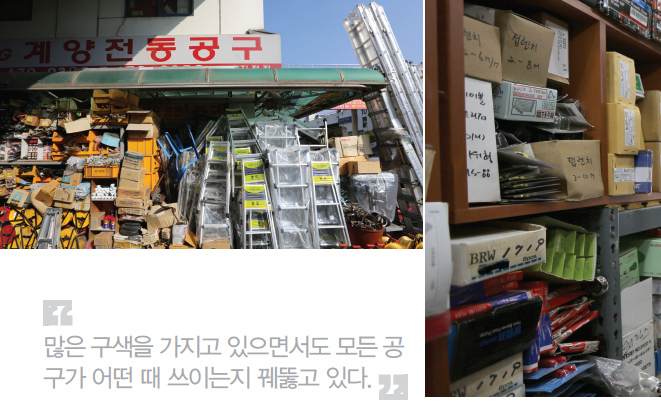 “지금은 대형 유통사가 발행하는 카달로그가 잘 되어 있고, 인터넷으로도 쉽게 공구지식을 얻을 수 있지만, 예전에는 그런 공구지식을 쉽게 얻을 수 없었어요. 그리고 조금만 깊게 들어가면 인터넷에는 공구에 대한 자세한 정보가 없습니다. 카탈로그도 마찬가지구요. 이 제품은 어떨 때 이런 상황에 쓰인다 그런 지식은 알 수 없잖아요. 저는 큰 형님 밑에서 그런 제품에 대한 자세한 지식을 배운 것이 지금까지 장사를 하며 살아오는데 큰 도움이 되었어요. 이 공구는 이럴 때 사용한다는 지식은 품목만 아는 지식과 다르거든요.”