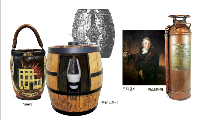오늘날 소화기의 초기 버전 ‘익스팅튜어(Extincteur)’는 1818년 영국인 조지 윌리엄 맨비(George William Manby)에 의해 발명되었다. 고층 건물의 불을 끄기 위해 고군분투하는 소방관을 위해 탄생한 익스팅튜어는 소화약제로 물을 사용하지 않은 최초의 소화기였다. 익스팅튜어에는 탄산칼륨과 공기가 압축되어 들어갔는데, 이 압력에 의해 분사 마개가 열리면 소화약제가 먼 곳까지 분사되었다. 덕분에 작동 시간이 빨랐고, 휴대하기 용이했으며, 장기간 보관할 수 있다는 장점을 가졌다.