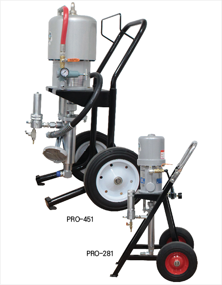 이 두 모델은 공압식 펌프입니다. PRO-281모델은 28:1의 압력비율로 최대 196바의 압력을 발휘할 수 있습니다. PRO-451모델은 45:1의 압력비율로 최대 315바의 압력을 발휘할 수 있습니다. 선박이나 건설, 인테리어 작업 등에 사용됩니다. 두 모델의 사용방법은 동일하므로 PRO-281모델을 대상으로 설명드리겠습니다.