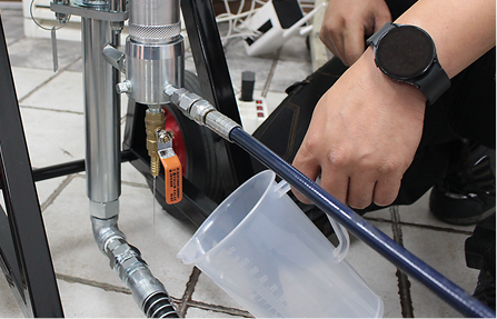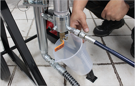 서지탱크 하단 밸브를 열어 도료를 제거하는 과정에서 메인밸브를 살짝 열어 도료의 배출을 돕고, 펌프 내부의 도료가 더 이상 흘러나오지 않으면 서지탱크 밸브와 메인밸브를 잠가줍니다. 이후로는 세척액을 이용해 PRO-60N모델처럼 작동시켰던 방법과 같은 과정으로 세척을 진행합니다.