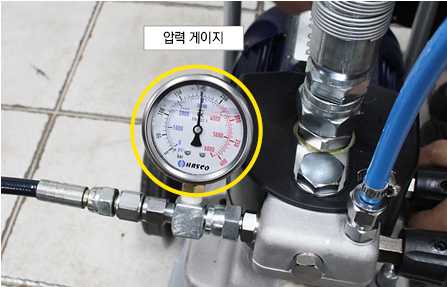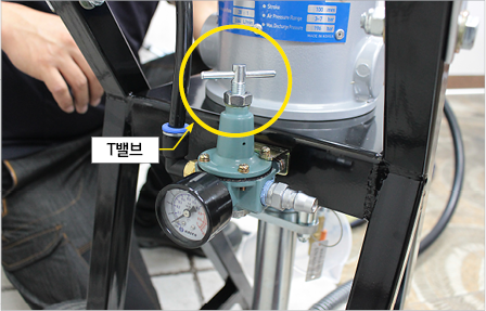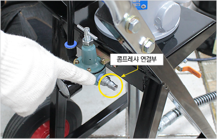그 다음 몸체 우측의 메인밸브를 잠근 뒤 펌프 뒤쪽 연결부에 에어 콤프레샤를 연결합니다.