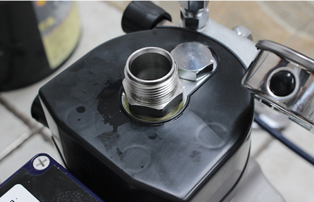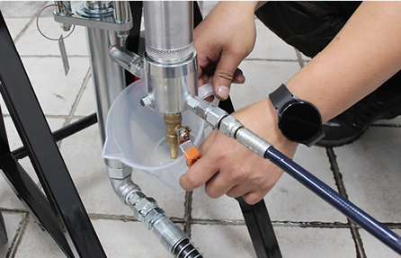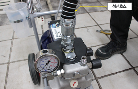 그리고 몸체 상단 연결부에 석션호스를 연결하고 상단 전면부의 연결부에 드레인호스를 연결합니다. 에어리스 펌프는 진공 상태를 만드는 것이 우선입니다. 드레인호스는 석션호스와 펌프에 들어있는 공기를 완전히 빼내 기계를 순환시키는 역할을 하는 호스입니다.