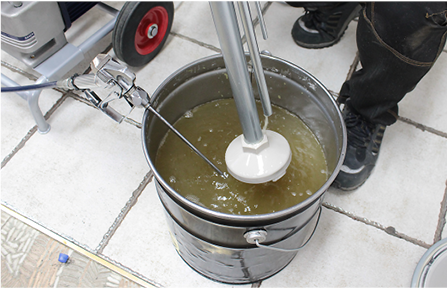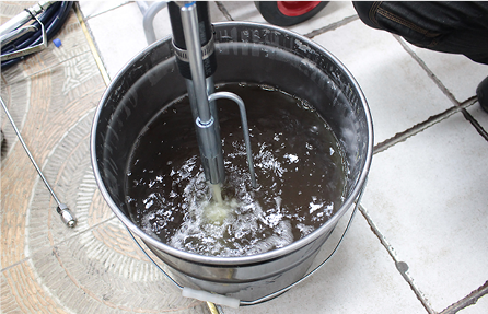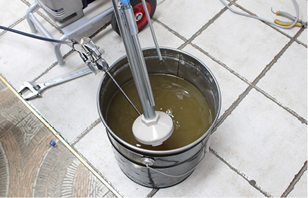 전원을 켠 뒤 석션호스와 드레인호스를 도료에 담급니다. 그 후 열어두었던 압력밸브를 얼마간 닫으면 드레인호스에서 석션밸브와 모터에 들어있던 에어가 나오면서 도료가 부글부들 대는 것을 확인할 수 있습니다. 그리고 조금 더 기다리면 드레인호스에서 도료가 흘러나오는 것을 확인할 수 있습니다. 이렇게 도료가 나오면 펌프 내부 순환은 다 된 것입니다. 이 상태에서 압력밸브는 다시 열고 드레인밸브는 잠가둡니다.