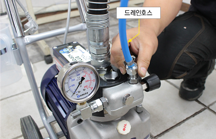 에어리스 펌프의 사용을 위해서는 압력밸브와 드레인밸브의 열고 닫는 순서가 매우 중요합니다.